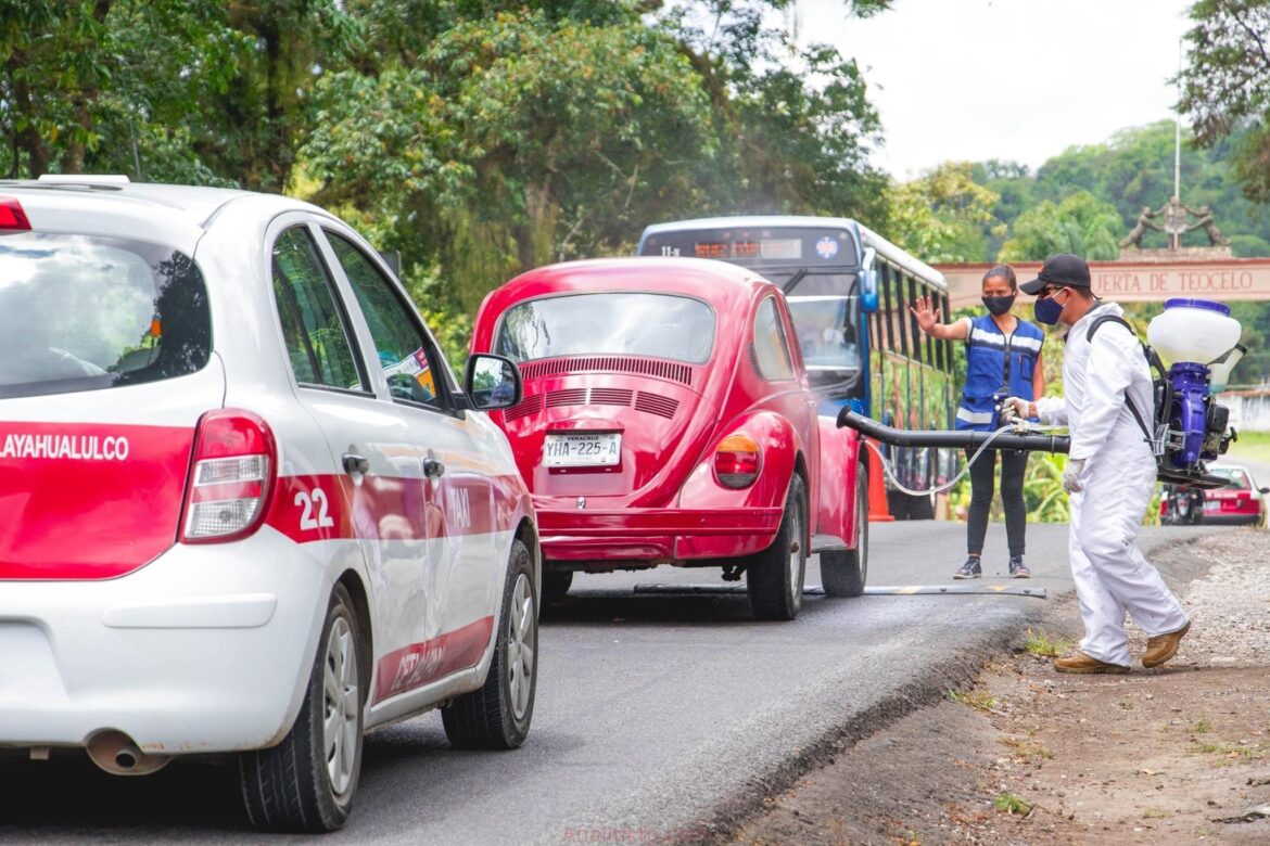 Teocelo, Ver., junio 5 del 2020.- Se intensifican este día las acciones de sanitización en el cerco sanitarios de nuestro municipio; personal de Protección Civil en coordinación con DIF Municipal, mantienen el cerco sanitario en el que se sanitiza vehículos y se inspecciona pasajeros que ingresan a nuestro municipio, además de exhortarles a llevar acabo de manera responsable las medidas de prevención ante la pandemia por COVID-19. Personal de Alumbrado Público continúa en la campaña de mantenimiento y sustitución de lámparas en mal estado, el día de hoy se atendieron los reportes de la comunidad de Texin. Servicios Generales da continuidad a la limpieza y desazolve de alcantarillas ante el inicio de la Temporada de lluvias y ciclones, hoy se dio mantenimiento a los traga-tormentas del callejón de Oaxaca, calle Independencia esquina calle Raúl Martínez y Col. Rocco, Guerrero esq. Con San Pedro.