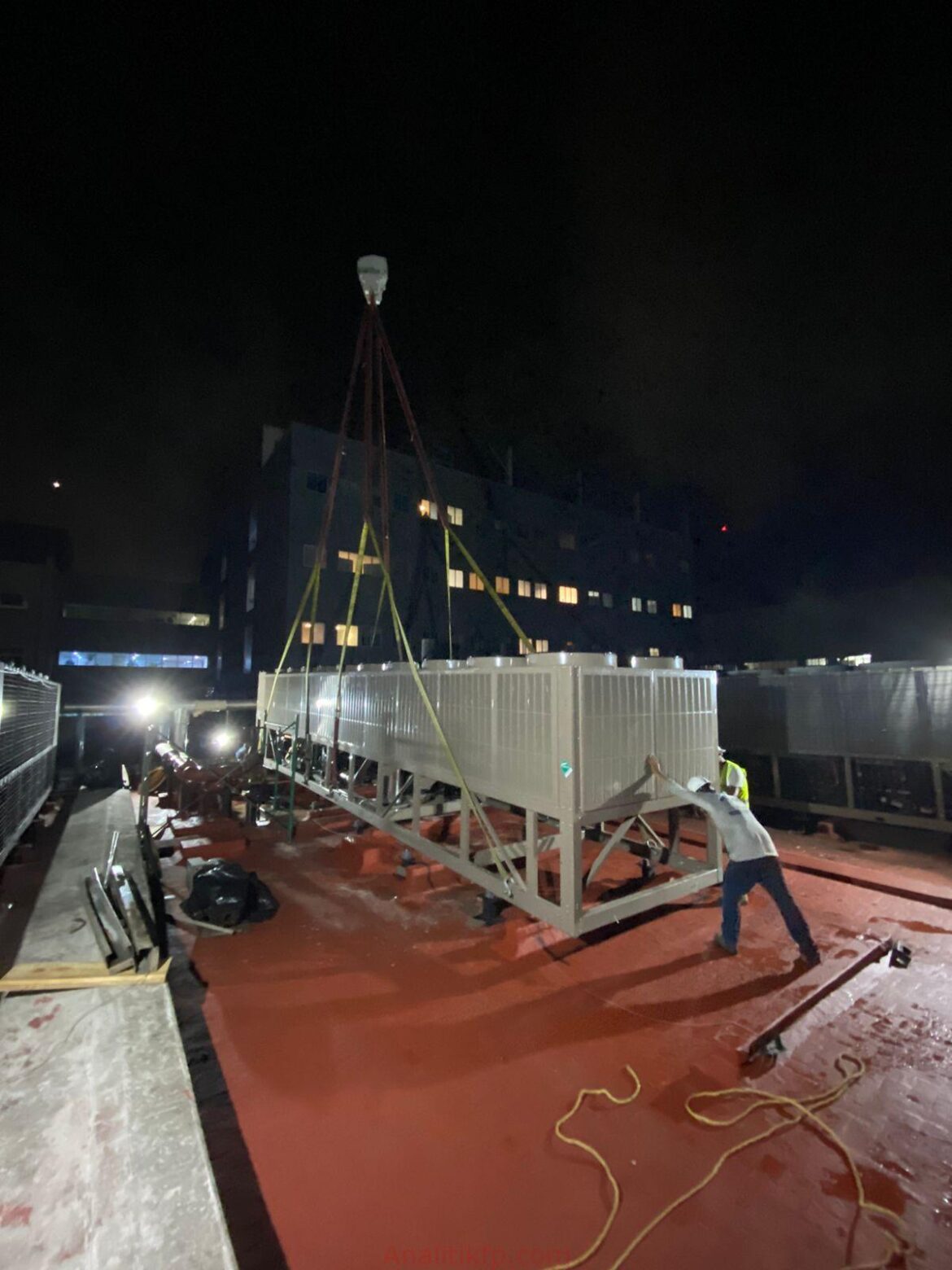 Con un peso de 5 toneladas y entre maniobras de alta complejidad fue colocado el equipo enfriador para todo el nosocomio.