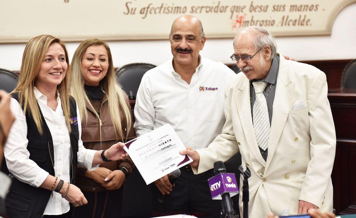 Xalapa, Ver.- Por su trayectoria como cronista emérito de Xalapa, aporte a la ciudad y trabajo para rescatar el pasado histórico y social de Xalapa, el presidente municipal Ricardo Ahued Bardahuil, en representación del Ayuntamiento, entregó un Reconocimiento a José Zaydén Domínguez, quien esta tarde presentó seis libros de su autoría, en la Sala de Cabildo.