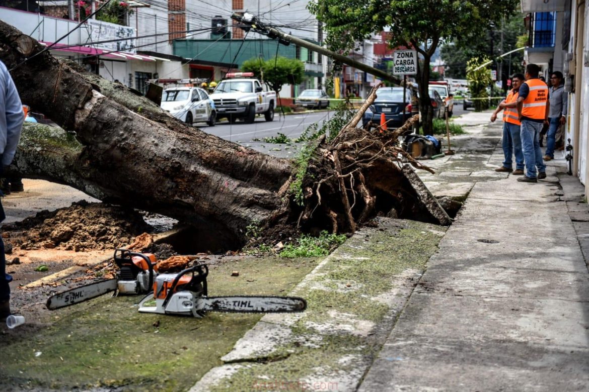 Xalapa, Ver.- Personal de las direcciones de Medio Ambiente, Alumbrado Público, Obras Públicas y Protección Civil Municipal atendieron la caída de un árbol en la avenida Mártires del 28 de Agosto.