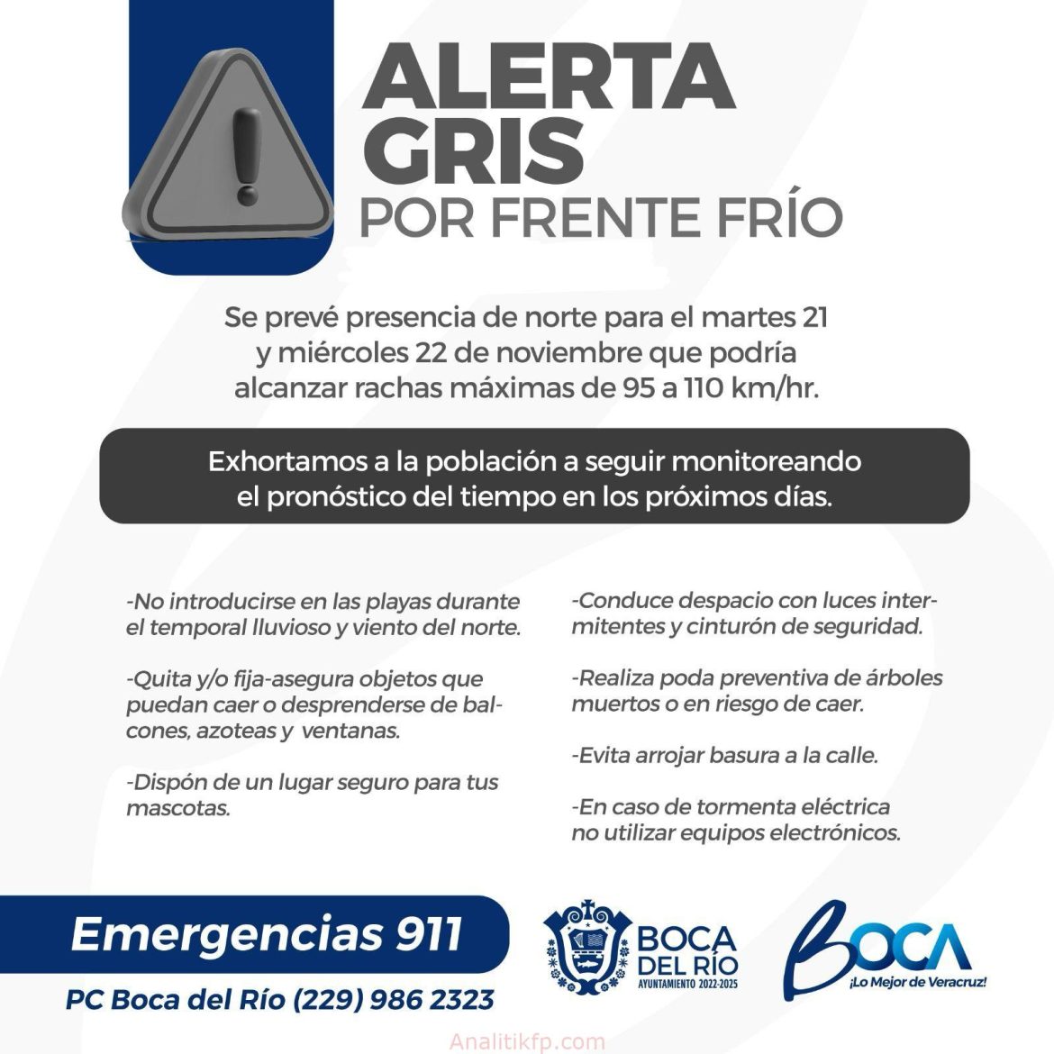 Con la emisión de la Alerta Gris por la Secretaría de Protección Civil del Estado de Veracruz, las Fuerzas de Tarea del Ayuntamiento de Boca del Río dan seguimiento al Frente Frío que impactará al territorio boqueño el próximo martes.