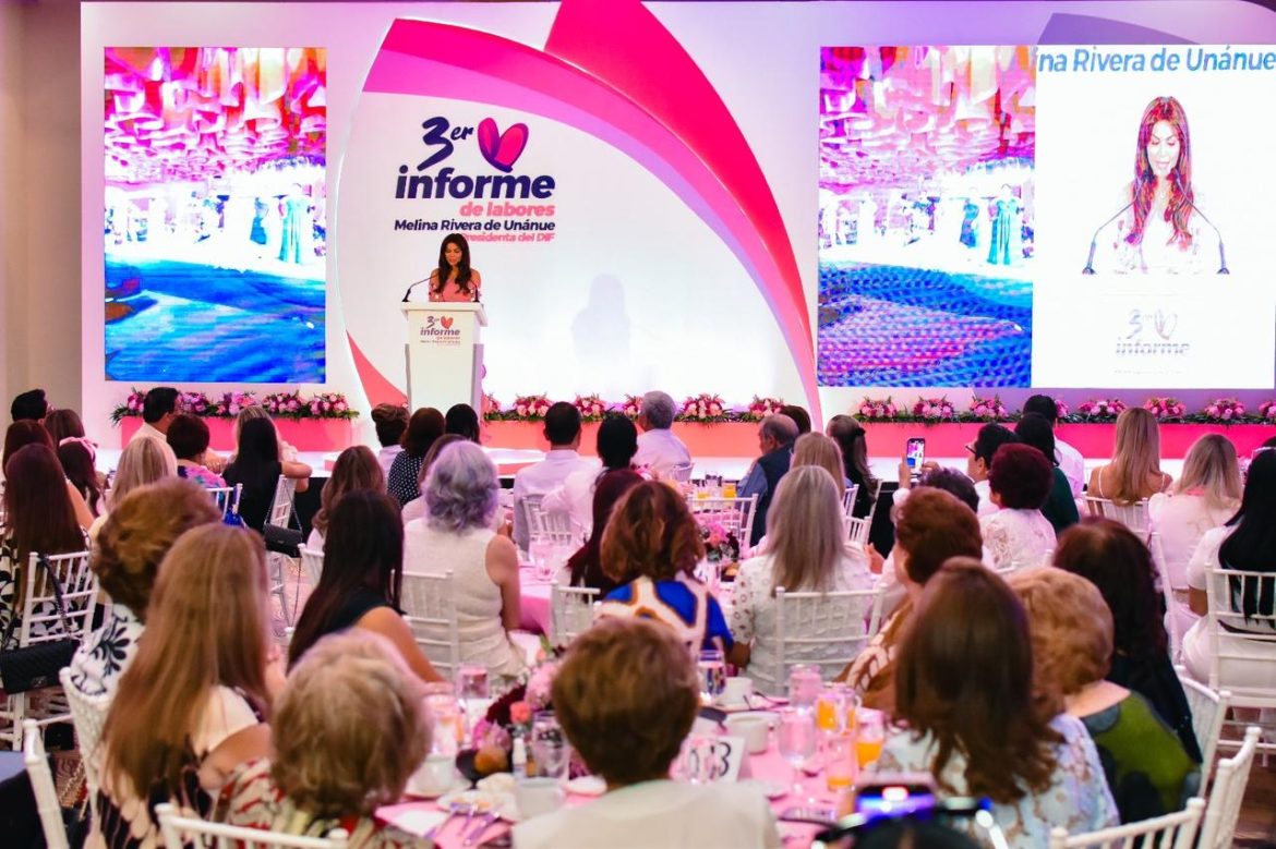 Rivera de Unánue reconoció importantes logros, como la atención integral a la infancia a través de los centros asistenciales CADIS y CAICS, festivales, campañas de salud y donativos entregados a diversas asociaciones que apoyan a niñas y niños vulnerables.